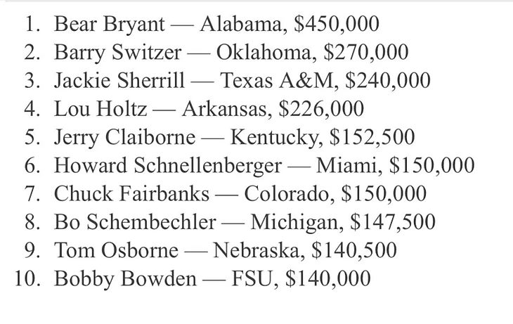 ТОП 10 зарплат тренеров по американскому футболу в колледжах США за 1981год , зарплата Брайнта с учетом инфляции сейчас бы составляла 1.27млн.$