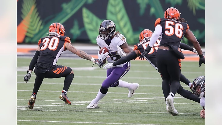"Цинциннати Бенгалз"-"Балтимор Рэйвенс" 3:38.Гости в 3 четверти набрали 21 очко.Квотербек Ламар Джексон заработал 113 ярдов,3 тачдауна и пропустил один перехват.Раннинбек Джей-Кей Доббинс имеет в активе 160 ярдов и 2 занесённых тачдауна,кикер Джастин Такер реализовал все 5 филд-голов.Квотербек хозяев Брендон Аллен заработал 48 ярдов и 2 тачдауна."Вороны" выиграли 5 игру подряд.