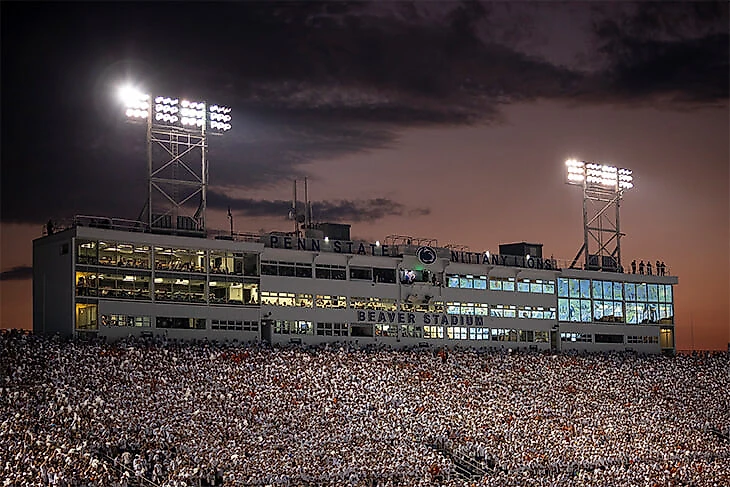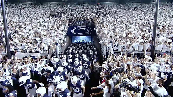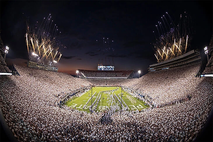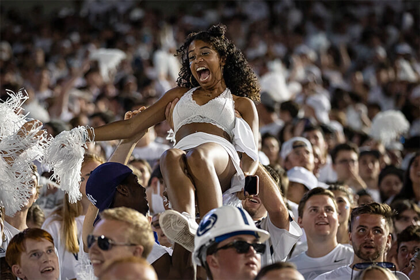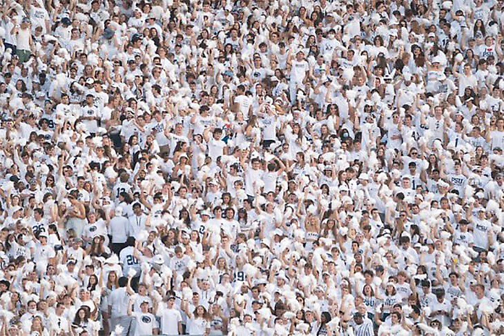 Недавно мы рассказывали про 80 тысяч, которые танцуют под Jump Around на матче в Висконсине. Но студенческий спорт США не перестает удивлять. На этот раз после пандемии вернулось главное шоу болельщиков «Пенн Стэйт» – команды Университета штата Пенсильвания по американскому футболу. Каждый год примерно 110 тысяч болельщиков (при официальной вместимости арены в 106 572 зрителя) собираются на игру, одевшись в вещи белого цвета.