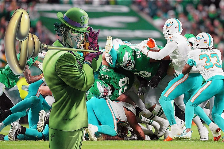Все игроки стягиваются к линии схватки, Джейлен Хертс забирает мяч у Джейсона Келси, после чего обоих общими усилиями втаскивают в первый даун. Эта картина уже стала привычной, поскольку «Филадельфия» абузит этот розыгрыш по полной программе уже полтора сезона.