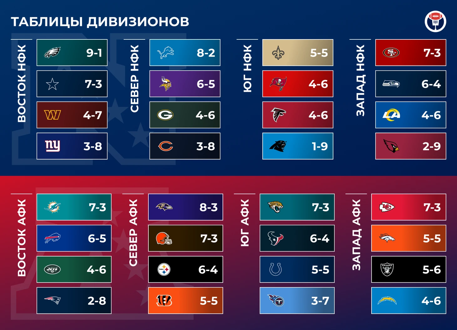 Сейчас результат «Пэтриотс» 2-8. Это слабейшая команда в Американской конференции. По разнице набранных и пропущенных очков (–98) хуже во всей лиге только «Джайентс». Если бы сезон закончился прямо сейчас, «Пэтс» выбирали бы в топ-3 весеннего драфта.