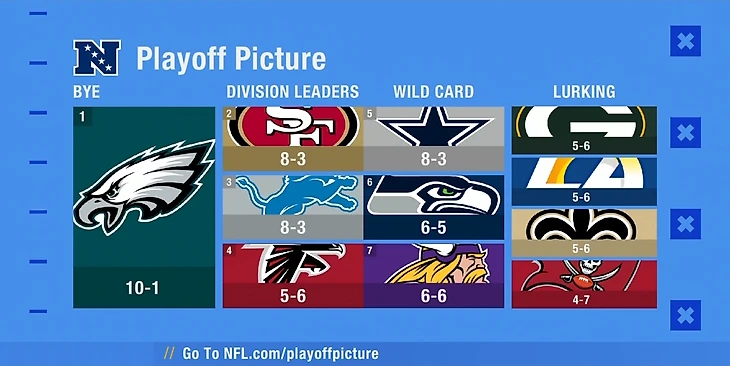 В НФК почти всё стабильно. «Иглс» собирают победы в равных матчах, и уже добрались до отметки в десять побед. В воскресенье - игра с «Сан-Франциско», фактически за первый посев в конференции. У «Фотинайнерс» есть шанс зацепиться за бай-вик, либо, в случае поражения, начинать прикидывать себе соперника по уайлдкард.
