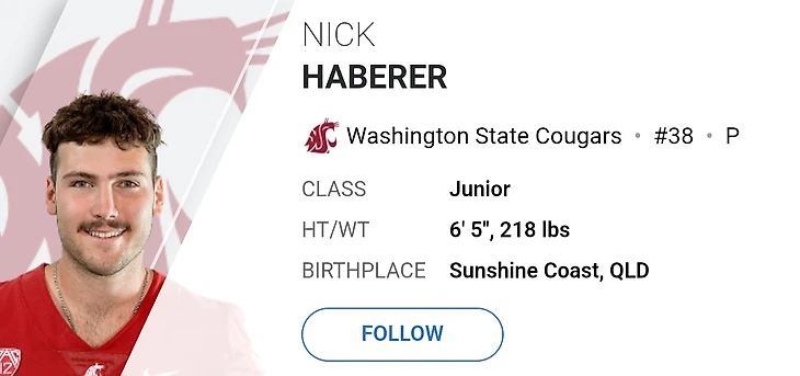 Завершим наш блок о легионерах в конференции Pac-12 рассказом о австралийском пантере Нике Хаберере. Сезон для Ника начался с матча против «Colorado State», в котором он набрал 133 ярда. Самый длинный пант австралиец сделал в матче против Стенфорда на 62 ярда. Самый же продуктивный матч выдался против «UCLA», в котором Хаберер ударил по мячу 9 раз на 404 ярда. Футболист не раз заявлял, что знает только базовые правила, что иногда приводило к плачевным ситуациям для «Washington State». Это немного напоминает о Гаро Епремяне, у которого было множество ошибок на футбольном поле из-за незнания правил. За сезон у австралийца получилось набрать своими пантами 2.088 ярдов и стать 28-ым пантером лиги.