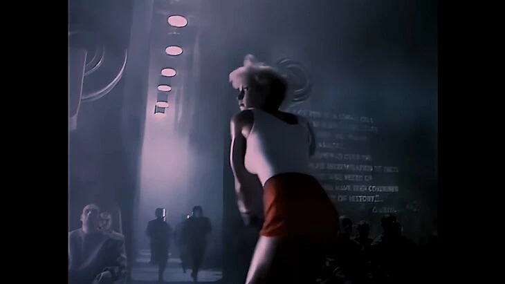 Антиутопическая история. Одинаковые лысые мужчины следят за огромным экраном, с которого гипнотизирует Большой Брат: «Мы впервые в истории создали чистую идеологию. Теперь каждый может очиститься от противоречий, мешающих постижению истины».