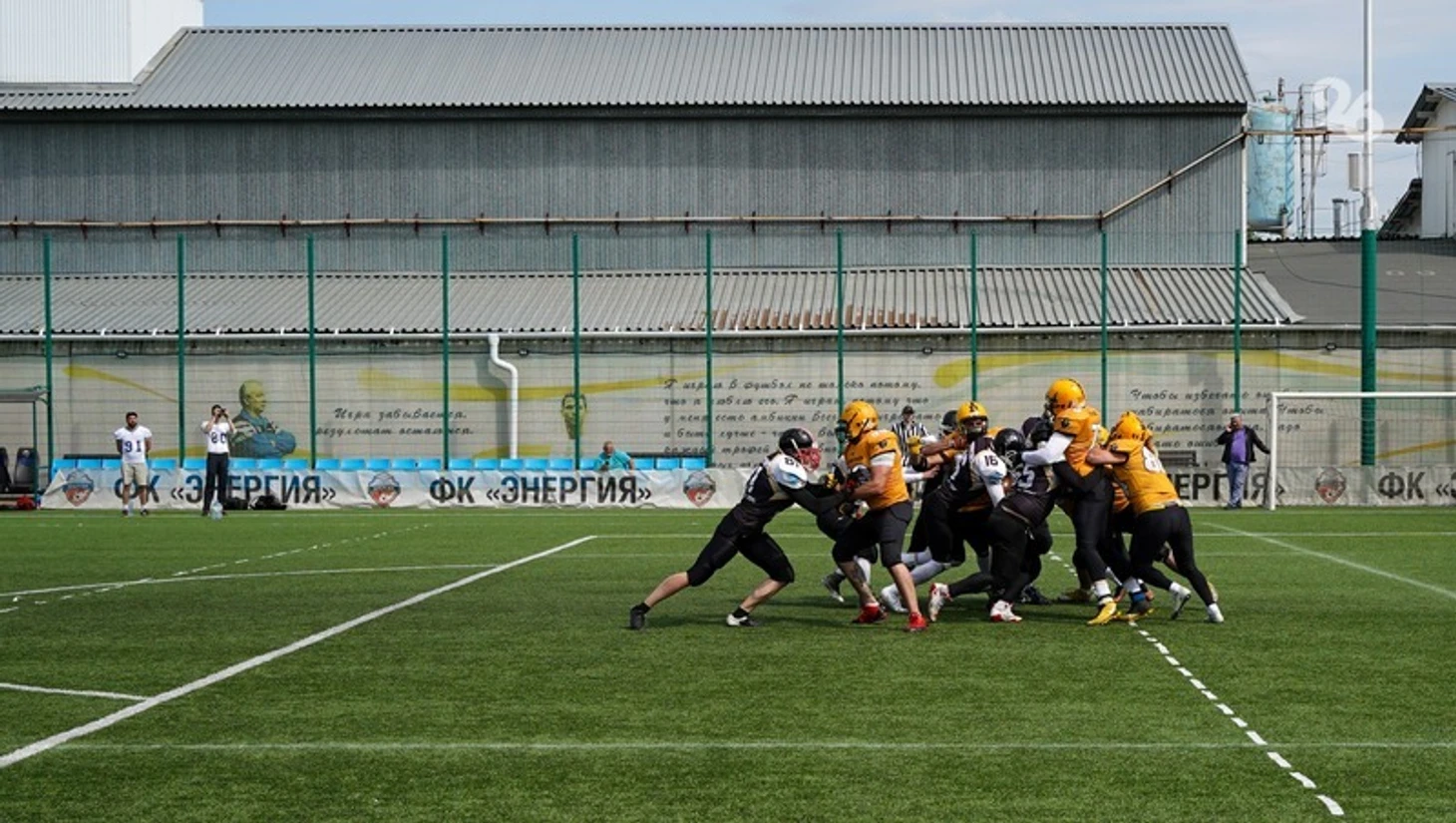 Погода выдалась хорошей: солнце светило ярко, но не создавало той жары, которая была на прошлой неделе. Иначе в шлемах и защите игроки чувствовали бы себя не слишком комфортно. Тем более что каждой команде, собравшейся на турнир, надо было сыграть сразу по две игры, по системе «каждый каждым». Матчи проходили в формате арена-футбола. Если в традиционном на поле находится 22 игрока, то в данном случае — по семь с каждой стороны. И размер площадки, соответственно, меньше. Американский футбол гибок в выборе формата матчей.