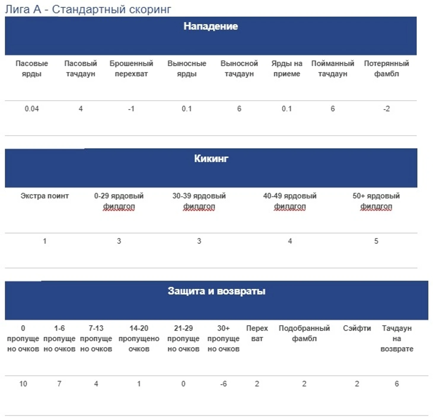 Лиге А имеет стандартную систему подсчета очков. Нет особого акцента на какой-либо позиции, но высокообъемные раннинбеки, как правило, более ценны, потому что у них гораздо больше возможностей набрать фэнтези очки, чем у других скилловых позиций.
