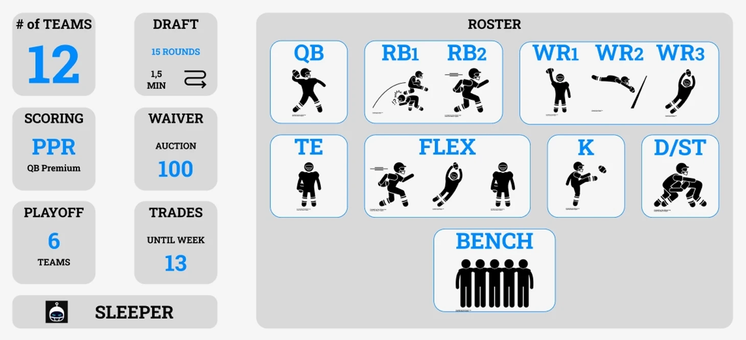 Все участники разделены на лиги. В одной лиге принимает участие 12 команд фэнтези-менеджеров. В плей-офф выходят 6 команд. Первые две получают бай-вик на первую неделю плей-офф. Драфт проходит онлайн в определенное время, выбранное участниками конкретной лиги. 15 раундов, то есть нужно выбрать 15 игроков, время на выбор 1,5 минуты. Менеджеры по очереди выбирают игроков так называемой змейкой, например, если игрок выбирает первым, то следующий пик будет 24, потом 25. Скоринг в лигах PPR (points-per-reception), то есть дается очко за каждый прием игрока. Также премиум для квотербеков, за каждый тачдаун 6 очков, а не как обычно 4. После каждой игровой недели проводится вейвер (можно взять свободных игроков) путем аукциона, менеджеры ставят какое-то количество условных единиц, если хотят забрать того или иного игрока. Всего дается 100 у.е. на весь сезон. Также могут проводиться трейды между участниками лиги. Трейды доступны до 13 недели сезона.