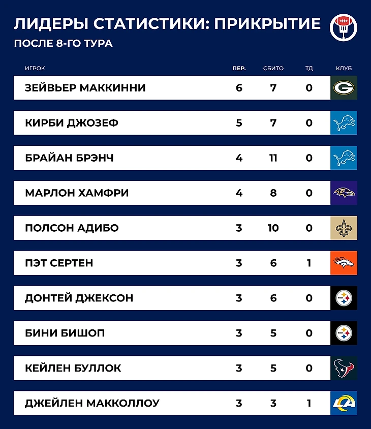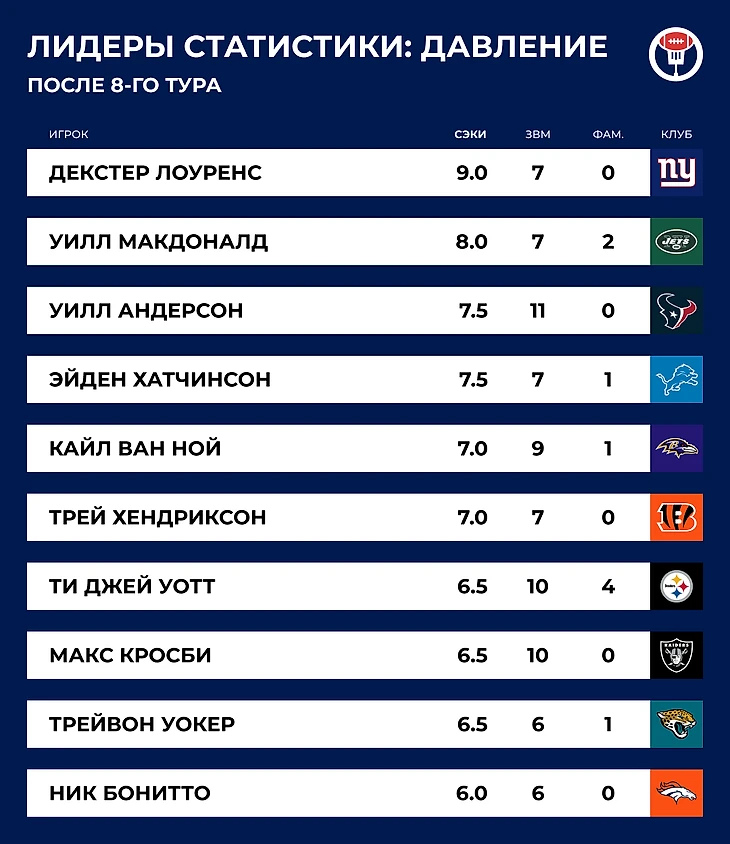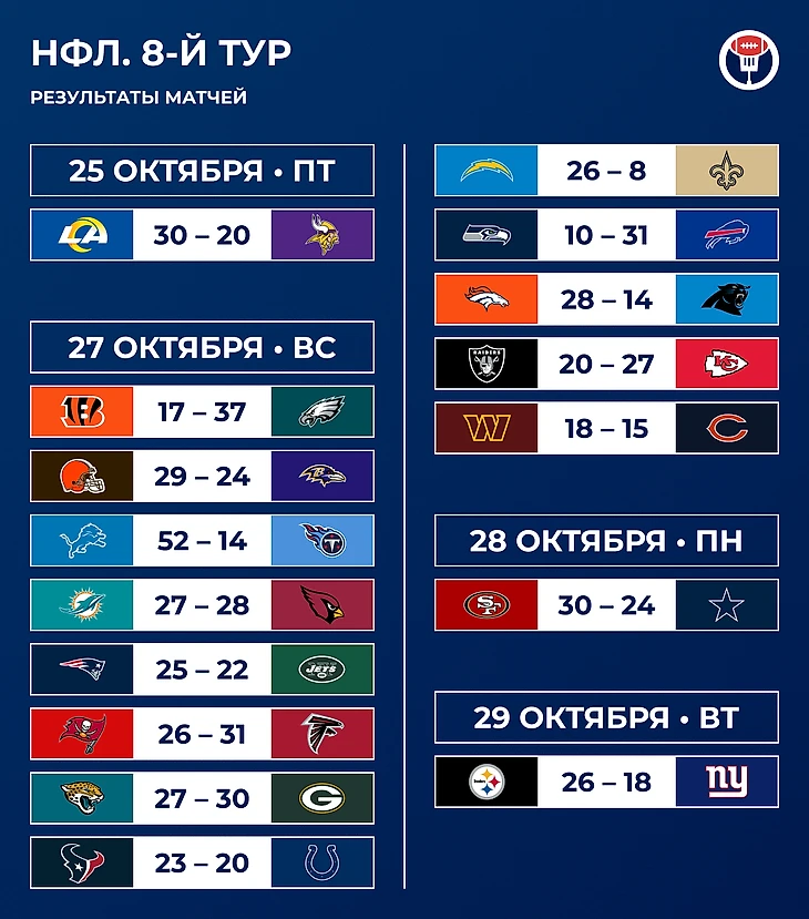 Однажды тайт-энд «Сан-Франциско» Джордж Киттл решил придумать праздник в честь игроков его амплуа. Идею подхватили, и вот уже который год в НФЛ отмечают Национальный День Тайт-Эндов. Смех смехом, но координаторы нападения явно делают акцент на игроках этой позиции в 8-м туре. В воскресенье тайт-энды суммарно приняли мяч 177 раз — больше, чем в любой другой день за всю историю лиги. Набранные 1965 ярдов — второй показатель в истории.