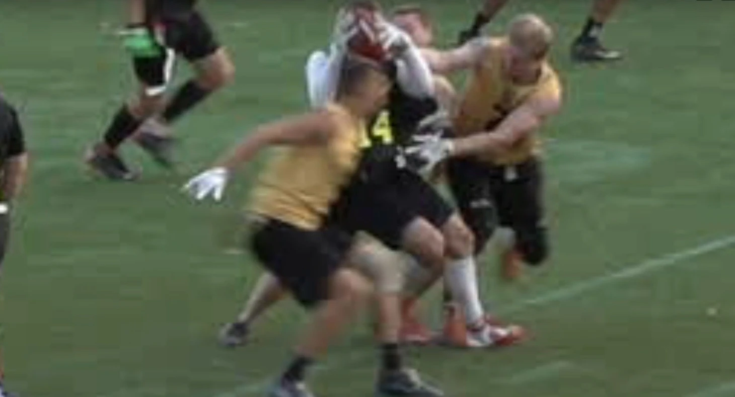Четвёртая попытка, для набора новых попыток остаётся 4 ярда. Слева Никита Пракутин и Никита Резник, справа Никита Гуреев. Снэп. Чернолуцкий выбирает кому бросить. Мяч летит на Никиту Гуреева, и когда казалось, что он поймал его, тот безжалостно падает на землю и Спартанцы всей командой начинают праздновать победу в матче.