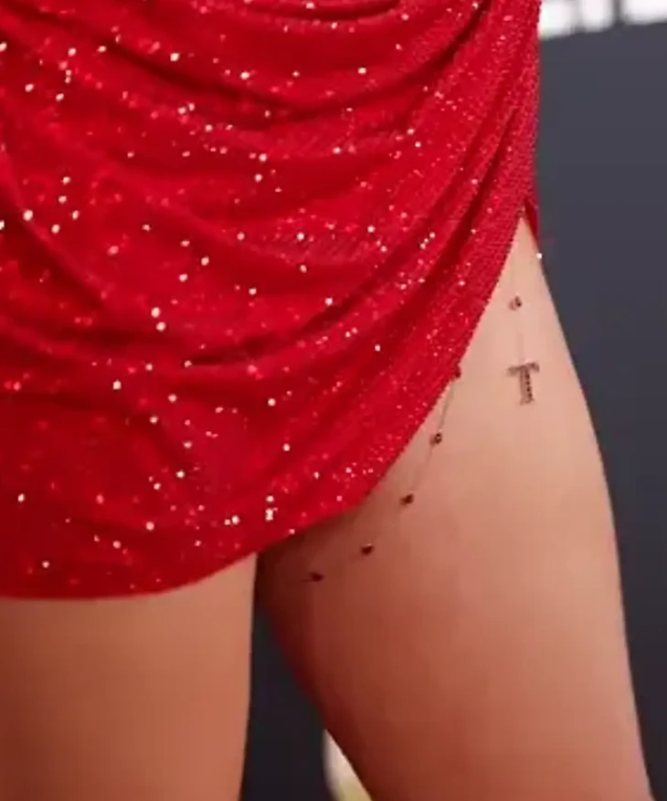 Тейлор покинула «Грэмми» без наград, несмотря на номинацию в шести категориях. Но запомнилась на красной дорожке, у нее на ноге была подвеска в виде буквы «Т». Видимо, в честь парня.
