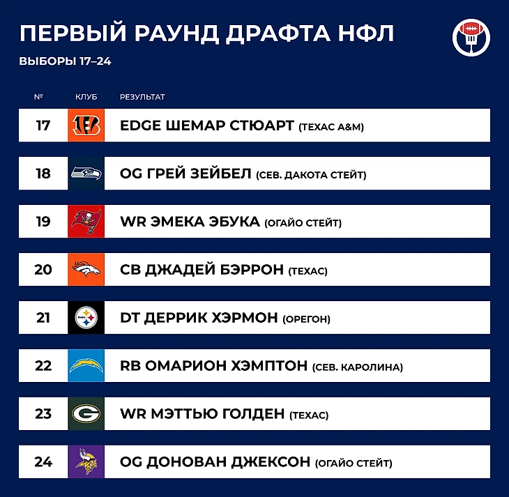 Среди топовых тайт-эндов произошла рокировка. На протяжении нескольких месяцев Тайлер Уоррен в прессе котировался выше, чем Колстон Лавленд. И только в заключительные дни перед драфтом я заметил, что журналисты сменили тон — мол, между ними трудно выбрать, а отдельные эксперты в моках стали ставить Лавленда выше. Поскольку дезинформации тоже хватает, я уже не стал менять свой прогноз, а стоило бы — в итоге Лавленд уехал в Чикаго под 10-м номером, а Уоррен в Индианаполис на четыре пика позже.
