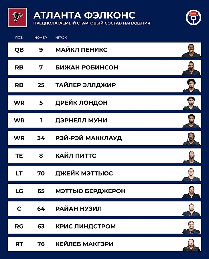 🃏 Козырь: Скилл-игроки. Почему за «Атлантой» всегда было интересно наблюдать в последние годы, так это из-за богатого набора плеймейкеров в нападении, которые, однако, редко составляли цельную картину из-за проблем квотербеков. Отличный дуэт бегущих, подбор ресиверов выше среднего, спорная, но не бесталанная фигура Кайла Питтса на позиции тайт-энда, линия нападения лучше, чем у большинства команд. Короче, если всё это склеить, то должно работать.