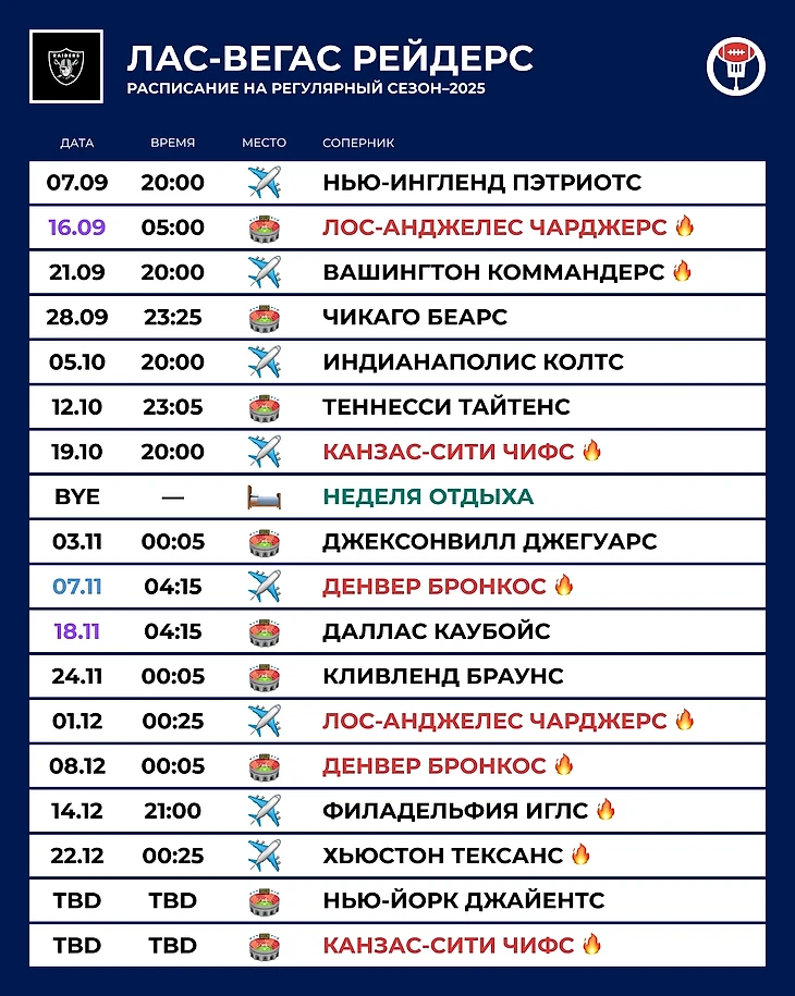 🎱 Прогноз: 10–7 и поражение в раунде уайлд-кард. Да, «Лас-Вегас» — один из моих кандидатов в сюрпризы сезона, причём даже для самих себя. Я знаю, какой аргумент сработает для половины коммьюнити. Неужели вы не согласны, что всё, чего касается рука Тома Брэди (кроме микрофона) становится золотом? Миноритарный владелец «Рейдерс» делает вид, что остаётся в тени, но де-факто исполняет роль теневого генменеджера — с тренерами переговоры вёл, обмен Джино Смита одобрял. Мне нравятся перспективы «Рейдерс» в нападении. Если о-лайн «Рейдерс» будет играть лучше, чем прошлогодний «Сиэтл», то Джино выдаст адекватную планку. Корпус ресиверов бедноват, но это не так критично, учитывая, что Чип Келли может опираться на Дженти и двух хороших тайт-эндов. К персоналу в защите вопросов больше, но нет ничего, что не может пофиксить хороший коучинг при благоприятном расписании.