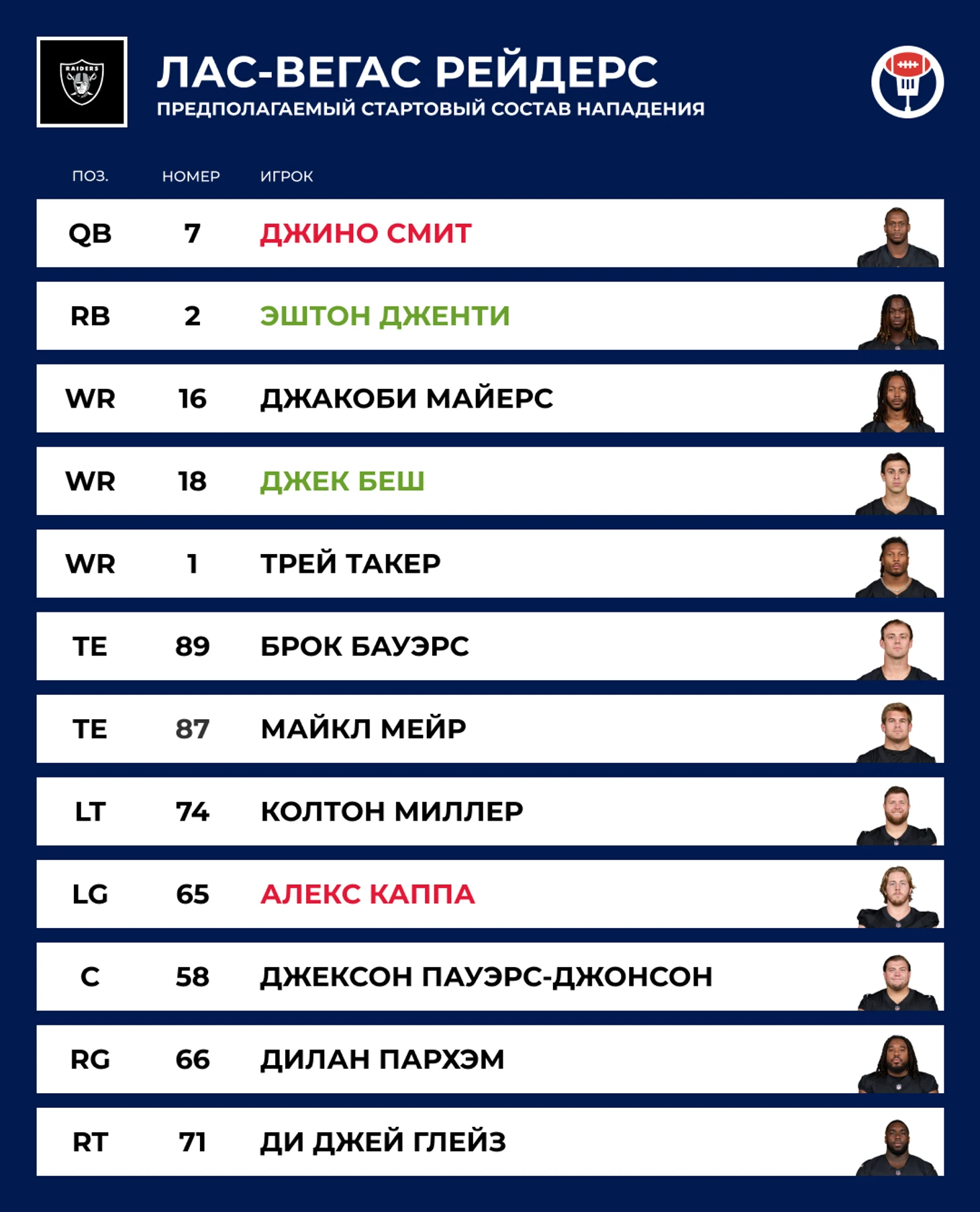 🎯 QB: Джино Смит. Пытаясь решить проблемный вопрос с квотербеком, «Лас-Вегас» сделал ход конём и обменял из «Сиэтла» Джино Смита. У Смита подходил к концу контракт с «Сихокс», и стороны явно по-разному воспринимали стоимость и сроки следующего. Смит долгое время считался бастом после того, как не заиграл в «Джетс» (а кто заиграл? Нет, ты скажи! Я жду!), а затем реабилитировал свою карьеру на северо-западе США после ухода Расселла Уилсона. Компетентный разыгрывающий, который в прошлом году несколько стух из-за слабой о-лайн.