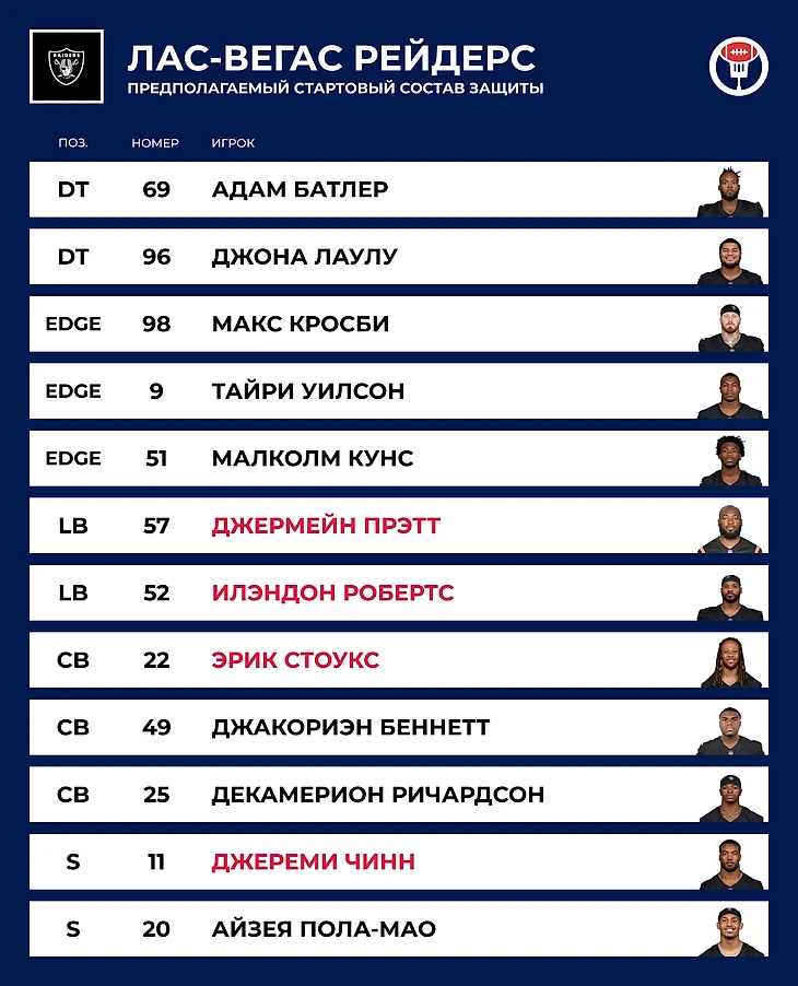 🃏 Козырь: Давление на квотербека. Даже без Уилкинса есть кому напрягать о-лайн соперников — абсолютная звезда Макс Кросби, недооценённый эдж Малколм Кунс возвращается после травмы крестов, потихоньку просыпается выбранный в первом раунде драфта–2023 Тайри Уилсон.