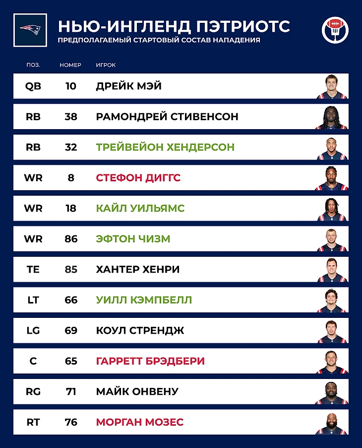 👔 Тренер: Майк Врейбел. Бывший лайнбекер «Пэтриотс» времён первой чемпионской династии, поймал 10 тачдаунов на приёме, в том числе в Супербоуле. С 2018-го по 2023-й тренировал «Теннесси» и выводил команду в финал конференции. Именно игра против «Тайтенс» Врейбела в плей-офф стала последней для Тома Брэди как для игрока «Пэтриотс». Врейбел пользуется большим авторитетом у игроков, считается сторонником железной дисциплины и известен фразой о том, что готов отдать свои кохонес ради тренерской победы в Супербоуле («я ведь уже давно женат»). Одновременно родной человек для клуба и не ученик Беличика, поскольку под его крылом как тренер никогда не работал.