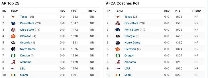 Техас на первом месте, но пара Пенн Стейт и Огайо Стейт достаточно близко (сыграют между собой в ноябре). Далее идут Клемсон, Джорджия и Нотр Дам, как видно и журналистам, и тренерам сложно определиться, кто здесь более предпочтителен, но все команды имеют хороший потенциал. Затем идет Орегон, от которого много ждали год назад и он был хорош на протяжении всей регулярки, но провалил игру в плей-офф с Огайо. Помните?