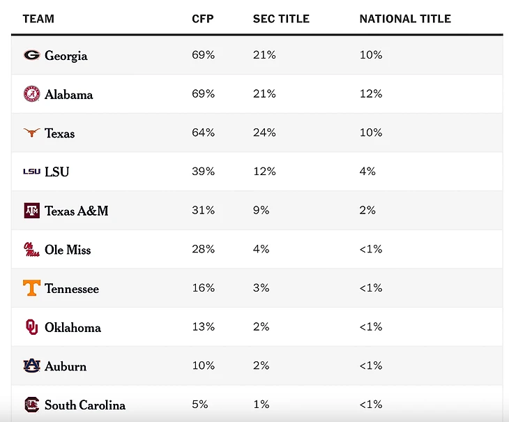Замыкают десятку команды с юга страны — Алабама во второй сезон де Буера, Луизиана с Брайоном Келли, который еще не выигрывал стартовый матч сезона во главе тигров, и Майами, в очередной раз построенные вокруг перспективного квотербека — учитывая конференцию шансы набить статистику хорошие.