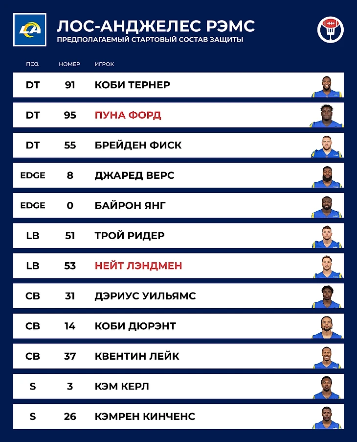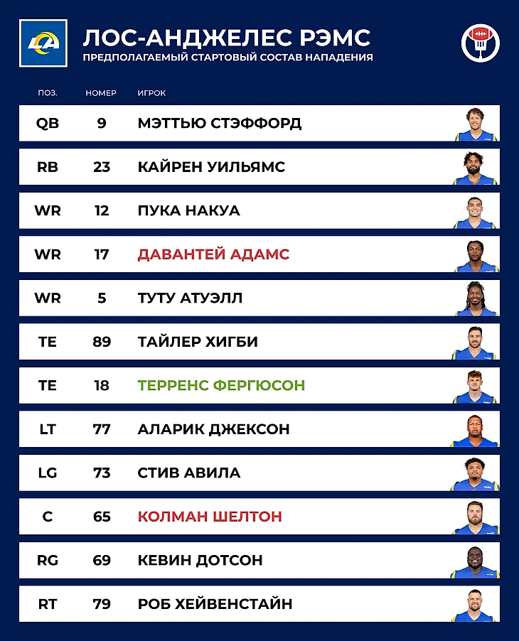 ⏪ Прошлый год: 10–7 и выход в дивизионный раунд. Из-за многочисленных травм «Рэмс» выдали очень тяжёлый старт 1–4, но как только команда перезарядилась во время ранней недели отдыха, сразу последовали победы. Из оставшихся 12 матчей регулярки «Лос-Анджелес» проиграл только трижды, включая уже ничего не решавший матч с «Сиэтлом» в заключительном туре. В статусе чемпионов дивизиона «Рэмс» выбили в первом матче «Миннесоту», закатав в асфальт её о-лайн и Сэма Дарнолда, а затем в упорнейшей борьбе (22:28) уступили будущим обладателям Супербоула «Иглс».
