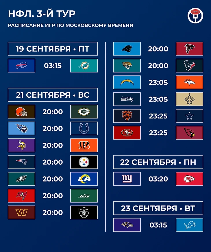 Брок Парди пропустил матч второго тура. Джо Бурроу выбыл до середины декабря. Джей Джей Маккарти пропустит две-четыре недели. Джастин Филдс находится в протоколе сотрясения мозга. У Джейдена Дэниелса растяжение связок колена, его участие в воскресной игре под вопросом.