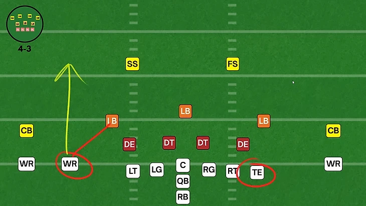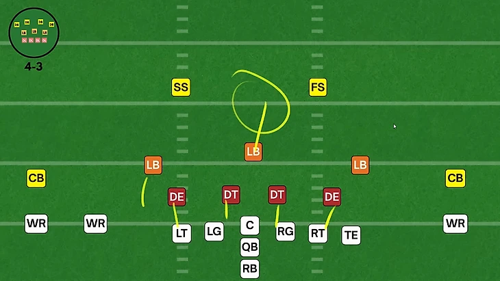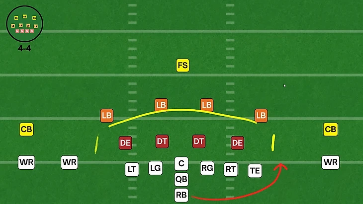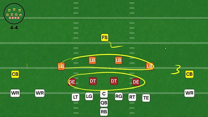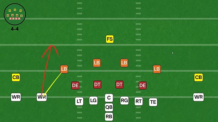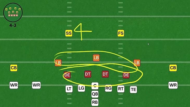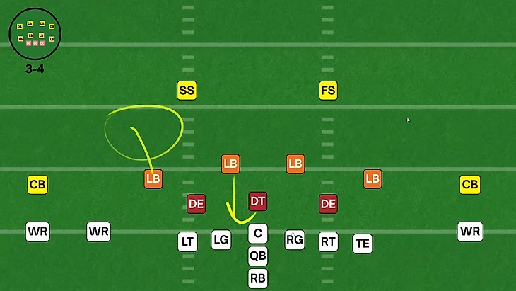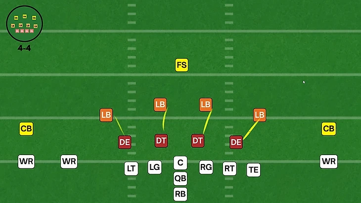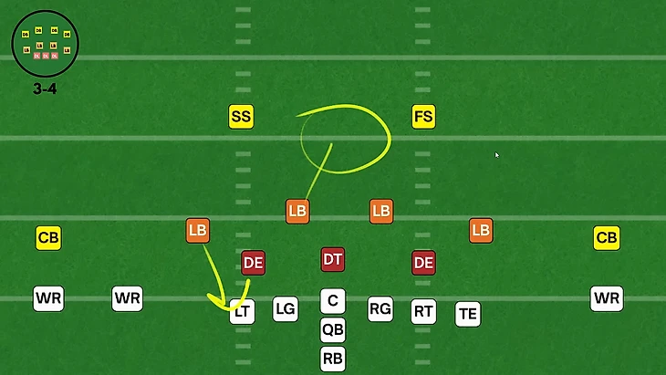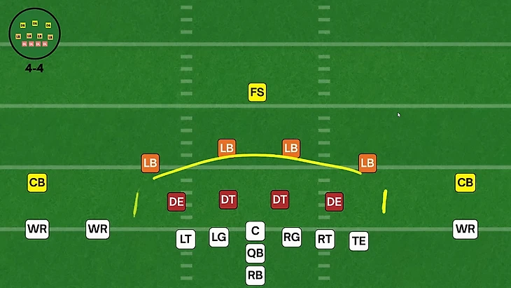 В данной формации четыре лайнбекера расположены ради контроля за краями линии атаки, то есть за пространством, внешним по отношению к тэклам нападения (OT), ➡️