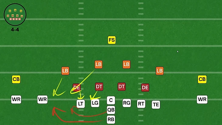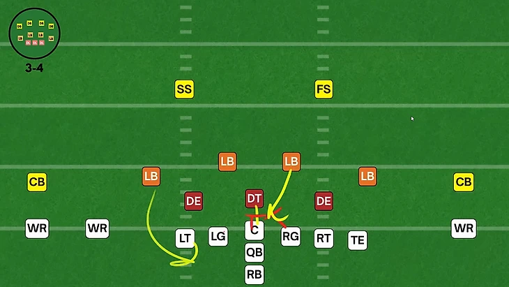 Поскольку атака часто чертит против ноуз-тэкла, центрального лайнмена в линии, двойные блоки, это позволяет освобождать внутренним лайнбекерам проходы и пространства, ➡️