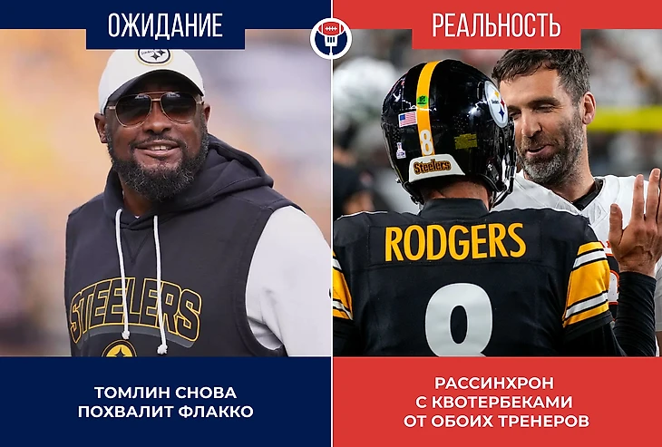 Несколько странно рассуждать о том, как спотыкалось нападение той или иной команды, после матча, в котором общими стараниями было набрано 64 очка. Тем не менее, пару примечательных эпизодов по ходу игры случились на бровках. У «Стилерс» – буквально в первой же четверти, когда гости попытались сыграть фли-фликер (раннинбек после вкладки отбрасывает мяч назад квотербеку, а тот бросает как правило дальний пас). Джейлен Уоррен щедро поделился мячом с Роджерсом, но тот как будто был неприятно удивлен таким развитием событий и, отметив отсутствие свободных ресиверов, просто выбросил мяч за пределы поля. А потом еще и наорал на раннинбека. Рассинхрон продолжился и на пресс-конференции. По словам Роджерса, в том розыгрыше фли-фликер не подразумевался вовсе, тогда как Майк Томлин придерживался иного мнения.