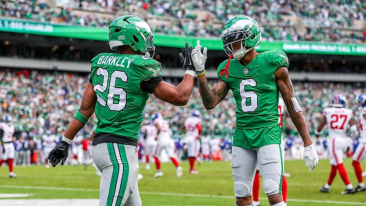 Баркли тем временем был недостижимым для защиты «Гигантов», бегущий демонстрировал с запасом лучшую форму в сезоне. Следующий тачдаун Сэйкуон заработал уже на приеме. Интересным моментом от тренерского штаба «Орлов» стало использование своих раннинбеков Баркли-Бигсби наподобие того, как это делают в «Детройте».
