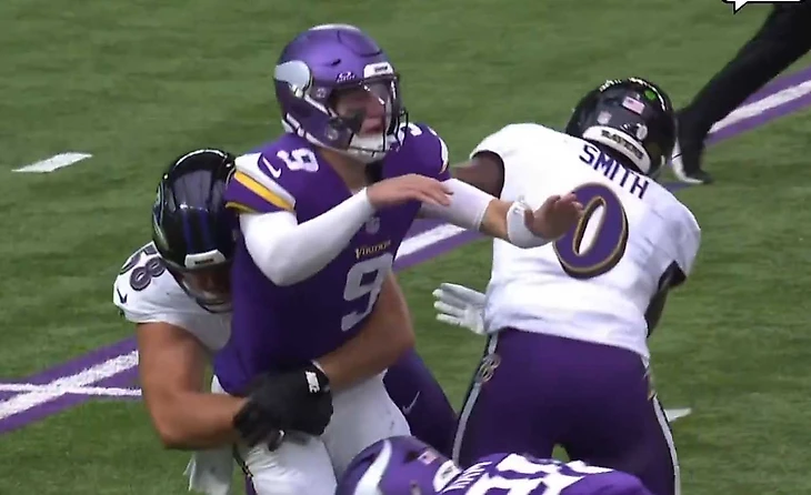 МакКарти бросает по центру на Аддисона, Смит перехватывает. Решение судей - инкомплит. Было, типа, касание земли мячом, который был жестко зафиксирован в руках и не вращался. Спорно. Помню, как года 4 назад судьи дали приём кому-то из Браунс в игре с Рэйвенс, в точно такой же ситуации. И уж, конечно, если бы так принял Джефферсон, это была бы чистейшая ловля.