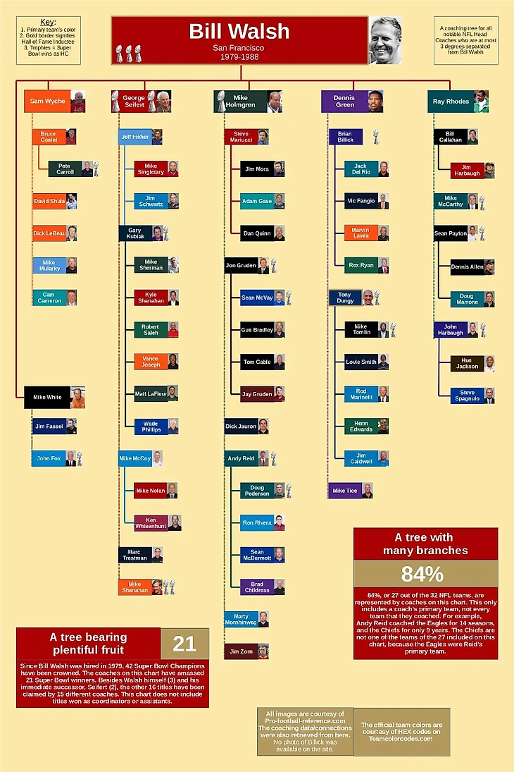 Тренерское древо – это такое понятие, которое показывает, сколько один тренер «вырастил» специалистов. У Билла Уолша было много учеников, которые продолжили использовать и модернизировать философию нападения западного побережья Уолша.