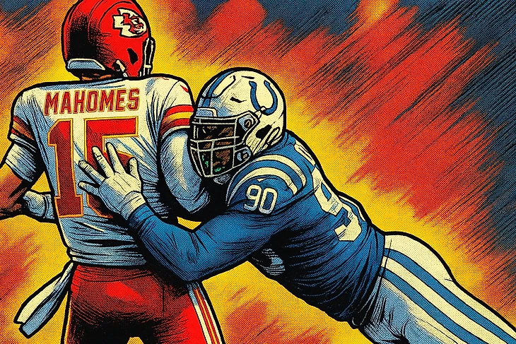 Рецепт игры против нападения «Индианаполиса» понятен — останови Джонатана Тейлора и нападай на Дэниела Джонса, он поплывет. Но это же надо еще воплотить в реальность. Допустим, с защитой против выноса у «Чифс» все неплохо — ровно 100 ярдов за игру, это топ-10 в лиге. С давлением на чужих квотербеков похуже — на уровне середняков.