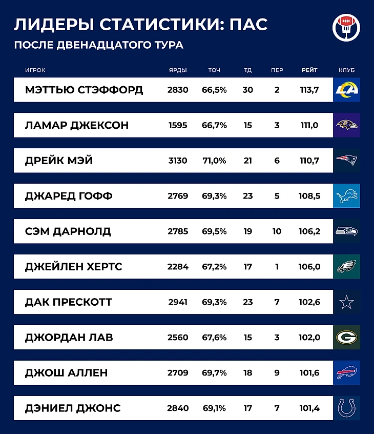 Мэттью Стэффорд бросил 27 тачдаунов подряд без перехватов — это самая долгая подобная серия среди квотербеков НФЛ как минимум с 1978-го. Разыгрывающий «Рэмс» считается фаворитом в борьбе за MVP.