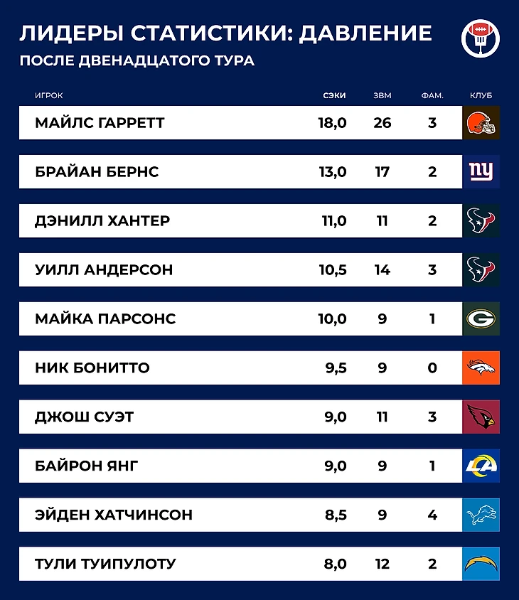 У «Далласа» траектория иная. В начале осени это была команда с шикарным нападением и одной из худших защит в лиге. Но с экватора, с девятой игровой недели пошел резкий позитивный тренд — если считать оттуда, то «Каубойс» пропускают по 69,7 ярдов на выносе за матч, это лучший результат в НФЛ. Обмены ди-тэкла Куиннена Уильямса и лайнбекера Логана Уилсона, а также возвращение в строй ди-беков Малика Хукера, Донована Уилсона и Шавон Ревела сделали свое дело.
