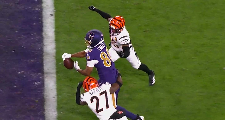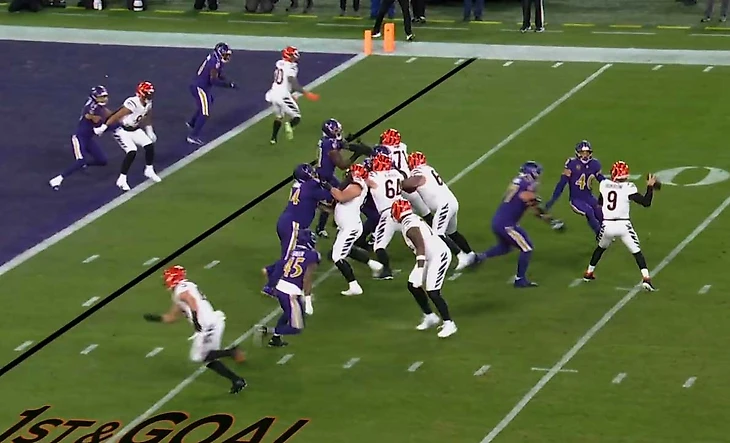 Ну как так? Атакуют только линией, вчетвером. Бурроу выбегает из конверта, пасует на Чейза, тот ловит, 13 ярдов. Где помеха пасу Бурроу? Где двойное прикрытие Чейза?