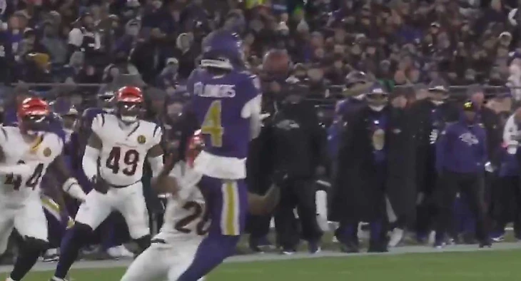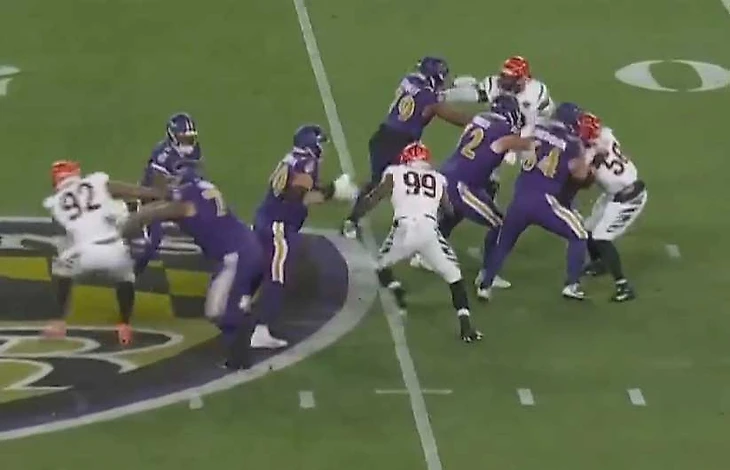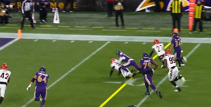 Ламар на Лайкли, слэнт. Лайкли убегает, его догоняют у линии и выбивают мяч. Весь вопрос: где? Либо успел и ТД, либо не успел и фамбл с тачбэком. Такая же фигня была у Флауэрса в финале АФК в 2023. Лайкли чего-то не очень доволен.