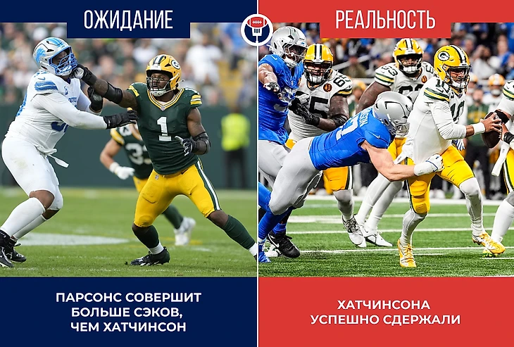 Для сравнения, «Детройт» ограничился лишь двумя ударами и ни один из них не был от Хатчинсона. Джордан Лав демонстрировал выдающийся перфоманс в относительно комфортных условиях (3,09 секунды в среднем на бросок – больше у него было дважды за сезон). «Лайонс» не помогло и возвращение в строй Маркуса Дэвенпорта, ди-лайн явно уступил в своей дуэли оппонентам из «Пэкерс». Кстати, после победы Парсонс заявил, что слова поддержки предварительно ему прислал Майлс Гарретт, лидер сезона по сэкам. Кто знает, может, Хатчинсону не хватило как раз подобного импульса. Эйден пока может похвастаться всего одной игрой в сезоне с более чем одним сэком, и при таком скромном вкладе защите «Львов» будет очень непросто на финише регулярки.