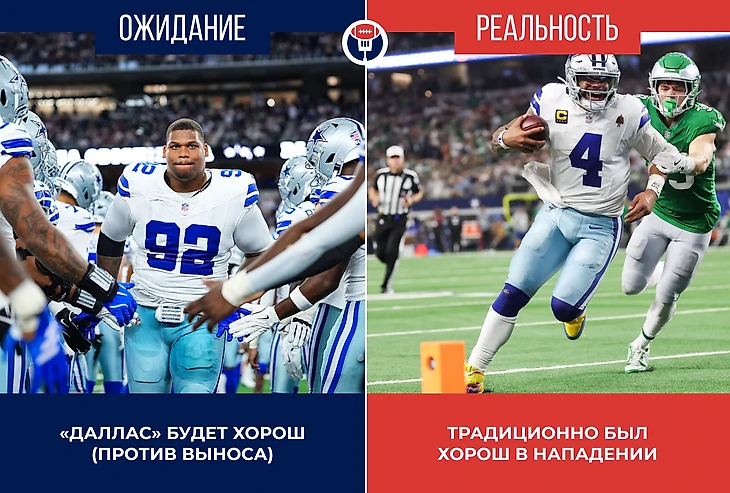 С одной стороны, лучший раннинбек «Чифс» набрал по земле 58 ярдов. С другой, у гостей в общей сложности получились 119 ярдов на выносе. С одной стороны, «Каубойс» бросили перехват в первом же владении. С другой, не пропустили за игру ни сэка и далее были более аккуратны с мячом. Сложно выделить строго один юнит «Далласа» по итогам победы над еще одним участником Супербоула. Третью неделю подряд защита «Ковбоев» не пропускает более 21 очка. Опять «Каубойс» находят в себе силы достойно ответить на пропущенные в дебюте тачдауны. Например, четырьмя подряд вынужденными пантами от «Канзас-Сити». Снова слов похвалы заслуживает пришедший по ходу сезона защитник – у Джадейвиона Клауни 2 сэка и 2 захвата с потерей ярдов.