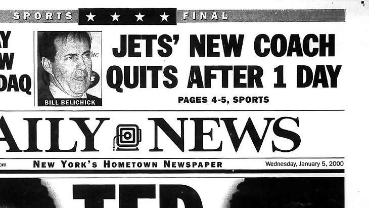4 января 2000 года Билл Беличик выступил перед представителями прессы на базе «Нью-Йорк Джетс» в Хемпстеде, штат Нью-Йорк, и объявил о своей отставке с поста главного тренера. Формально, он даже не приступал к выполнению своих обязанностей. Беличик, координатор защиты и ассистент главного тренера Билла Парселлса в течение предыдущих трёх сезонов, стал главным тренером «Джетс» двумя днями ранее после того, как Парселлс вследствие неудачного сезона с результатом 8-8 объявил президенту команды Стиву Гутману о завершении карьеры. Шестилетний контракт, подписанный Беличиком с командой в 1997 году, предусматривал, что он станет главным тренером «Джетс» сразу после ухода Парселлса. Таким образом, назначение Беличика на эту должность было произойти автоматически.