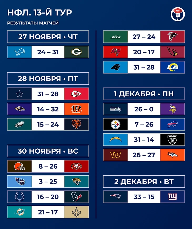 Во всех трех матчах на День благодарения победили андердоги. «Чикаго» обыграл действующих чемпионов Супербоула в два владения, вынудив главного тренера Бена Джонсона бегать по раздевалке с голым торсом. На Юге АФК интрига еще в октябре лежала в реанимации, а сейчас «Хьюстон» победил «Индианаполис» для того, чтобы на первую строчку взгромоздился «Джексонвилл». «Канзас-Сити» опять вернулся к нулевому балансу побед и поражений — нет уверенности, что у команды Энди Рида осталось право на еще одну осечку. Даже «Рэмс» — последняя команда, в чьей силе и стабильности не было сомнений — сенсационно уступили «Каролине».