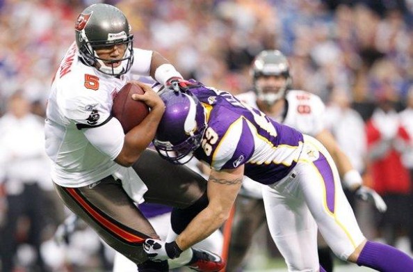 Может в цифровом выражении заслуги в матче Джареда Аллена и не впечатляют, но он показал всем, как завести болельщиков, когда матч уже безнадежно потерян. Повздорив с лайнменом Тампы, который разве что не сел на Джареда, когда розыгрыш для них по сути закончился, и получив рассечение носа, ди-энд Викингов просит поддержки для команды у публики вплоть до следующего снэпа. А потом просто отодвигает того же лайнмена и делает сэк. Даже я не удержался от восхищенного "уххх!", что у говорить о болельщиках, которые отреагировали как на тачдаун.