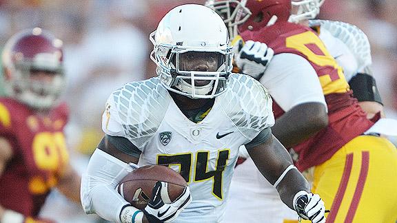 На Западном Побережье в прямом эфире показывали перестрелку. Но ничего криминального и обошлось без жертв: Орегон выиграл у Троянцев 62-51. Комментировать такие матчи невозможно, поэтому просто добавлю, что квотербеки набрали на двоих девять тачдаунов и 789 ярдов, а раннинбек Уток Кеньон Барнер набегал на 321 ярд и пять тачдаунов.