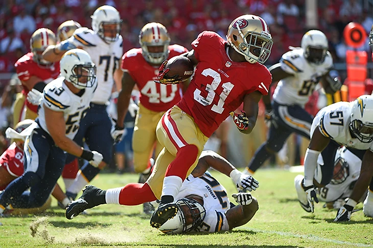 Если же рассматривать статистику не по лиге в целом, а по каждой команде по отдельности, то тоже обнаружатся интересные подробности. У «Цинциннати» основной состав – это один бэк и два тай-энда – используется в 43% атак. «Грин-Бэй» задействует трех ресиверов одновременно в 77% процентов розыгрышей. «Джетс», пытаясь в прошлом году создать максимально комфортные условия для Джино Смита, чаще других клубов NFL использовали четырех принимающих (4%). Здесь же мы найдем ответ на вопрос, заданные несколькими абзацами ранее. Итак, по данным 2013-го года только две команды лиги использовали состав с двумя бегущими чаще остальных вариантов персонала – «Сан-Франциско» и «Окленд». 49-ers использовали персонал 21 и 22 в 52% розыгрышей, а в еще в 2% случаев роль бегущего выполнял футболист другого амплуа. У «Рейдеров» состав 21 был задействован в 36% случаев. Все. Больше нет ни одного клуба, для которого состав с двумя бэками или формация с двумя игроками в бэкфилде были бы основными. В 2012-м таких команд было тоже две – те же «Сан-Франциско», плюс «Миннесота».