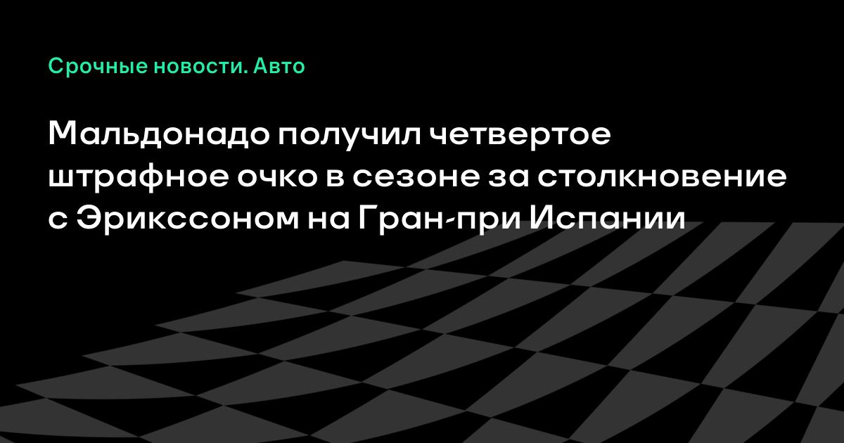 По итогам Гран-при Испании с суперлицензии пилота «Лотуса» Пастора Мальдонадо было списано одно штрафное очко. Это стало дополнительным наказанием за столкновение с Маркусом Эрикссоном в начале гонки, за которое Мальдонадо получил штраф в виде пятисекундного «стоп-энд-гоу». Для Мальдонадо это штрафное очко стало уже четвертым, полученным в нынешнем сезоне, сообщает F1 Fanatic.