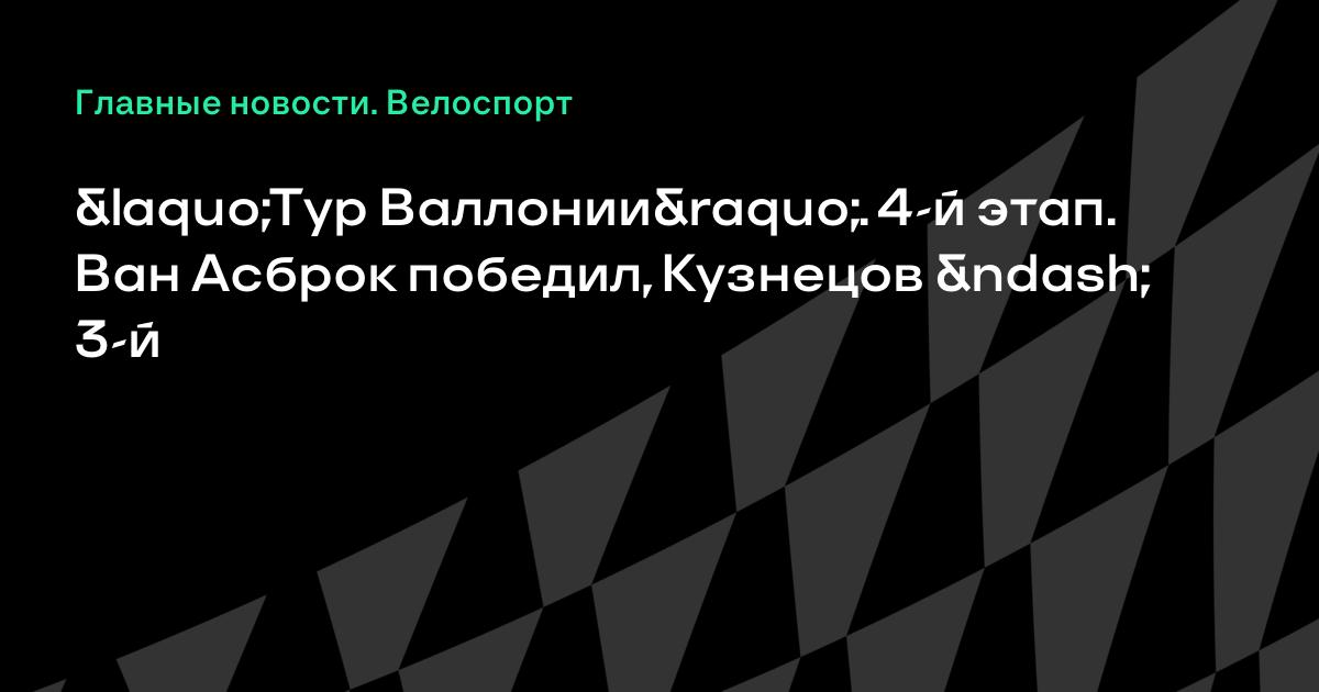 Сегодня прошел 4-й этап веломногодневки «Тур Валлонии». В финишном спринте победил бельгиец Том Ван Асброк, россиянин Вячеслав Кузнецов финишировал 3-м.