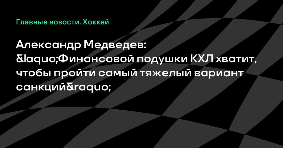 Президент КХЛ Александр Медведев заявил, что лига готова к самому тяжелому развитию событий после введения санкций против российских компаний.«Я уже говорил, что санкции не могут не затронуть прежде всего наших владельцев и спонсоров клубов, но у нас финансовая подушка достаточная для того, чтобы лига прошла самый тяжелый вариант.