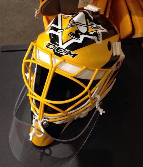 Шлем голкипера окрашен в те же цвета, что и форма, а сверху изображен логотип «Питтсбурга».