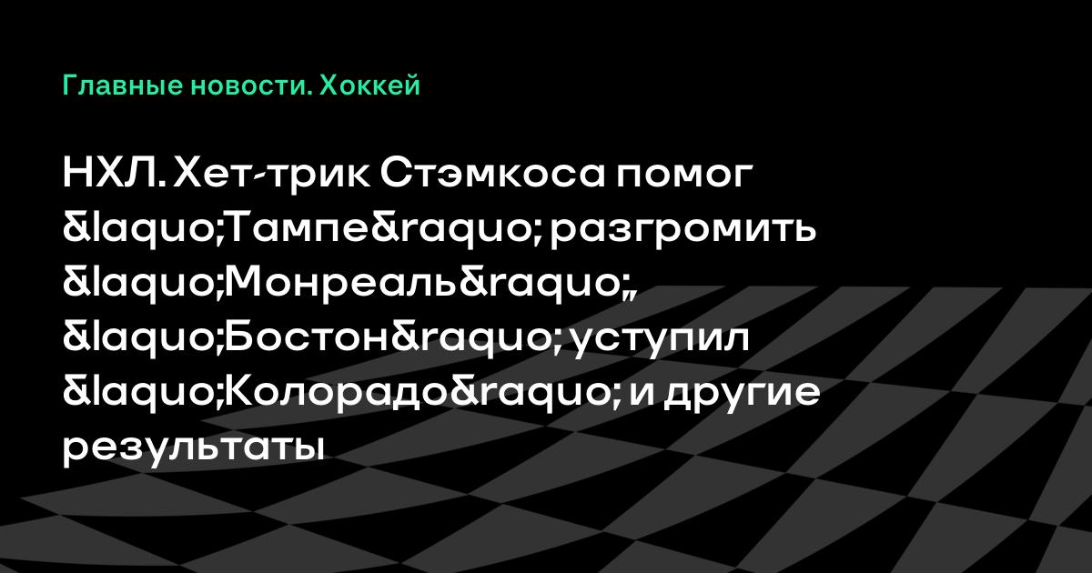 НХЛ. Хет-трик Стэмкоса помог «Тампе» разгромить «Монреаль», «Бостон» уступил «Колорадо» и другие результаты