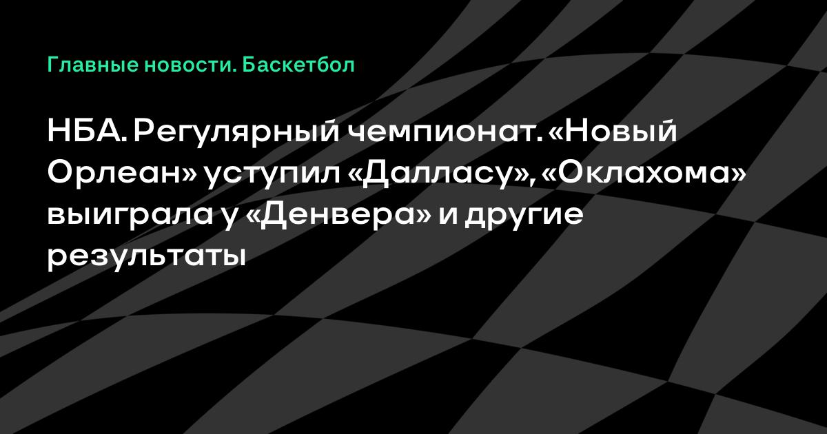 НБА. Регулярный чемпионат. «Новый Орлеан» уступил «Далласу», «Оклахома» выиграла у «Денвера» и другие результаты Сегодня состоялись двенадцать матчей стартовавшего на этой неделе регулярного чемпионата НБА. В Новом Орлеане местные «Пеликанс», несмотря на 31 очков и 15 подборов Энтони Дэвиса, уступили «Мэверикс» (104:109). Ослабленная травмами «Оклахома» одержала победу над «Денвером» Тимофея Мозгова (102:91).
