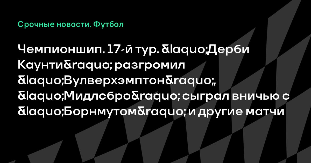 Чемпионшип. 17-й тур. «Дерби Каунти» разгромил «Вулверхэмптон», «Мидлсбро» сыграл вничью с «Борнмутом» и другие матчи