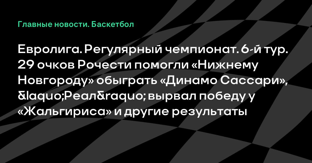 Евролига. Регулярный чемпионат. 6-й тур. 29 очков Рочести помогли «Нижнему Новгороду» обыграть «Динамо Сассари», «Реал» вырвал победу у «Жальгириса» и другие результаты